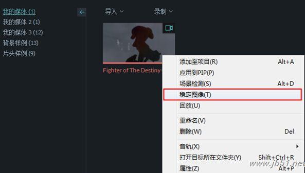 在媒体库中,单击选中目标视频,并单击右键,选择“稳定图像”;
