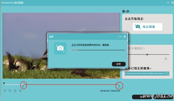 拖动入点、出点,选择需要稳定的时间范围,并点击“稳定图像”按钮开始稳像处理;