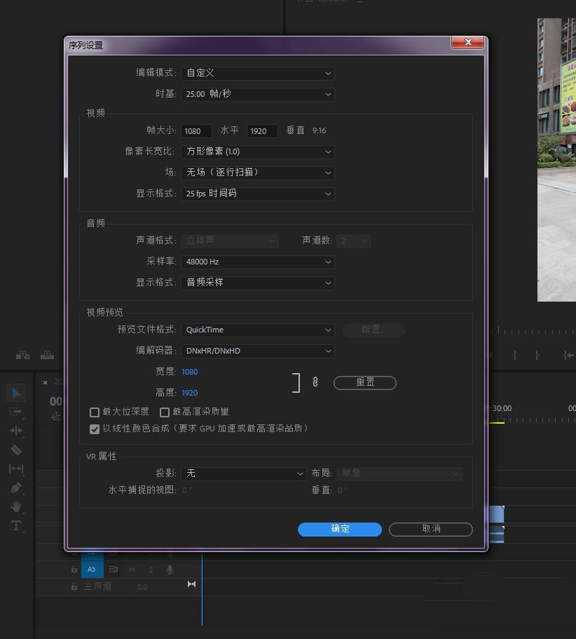 3、点击设置,参数如图,然后确定就可以开始剪辑视频了,通常拍摄素材会比设置的瘦一点,在节目里面双击视频可以拉大,或者效果控件里面设置缩放指数