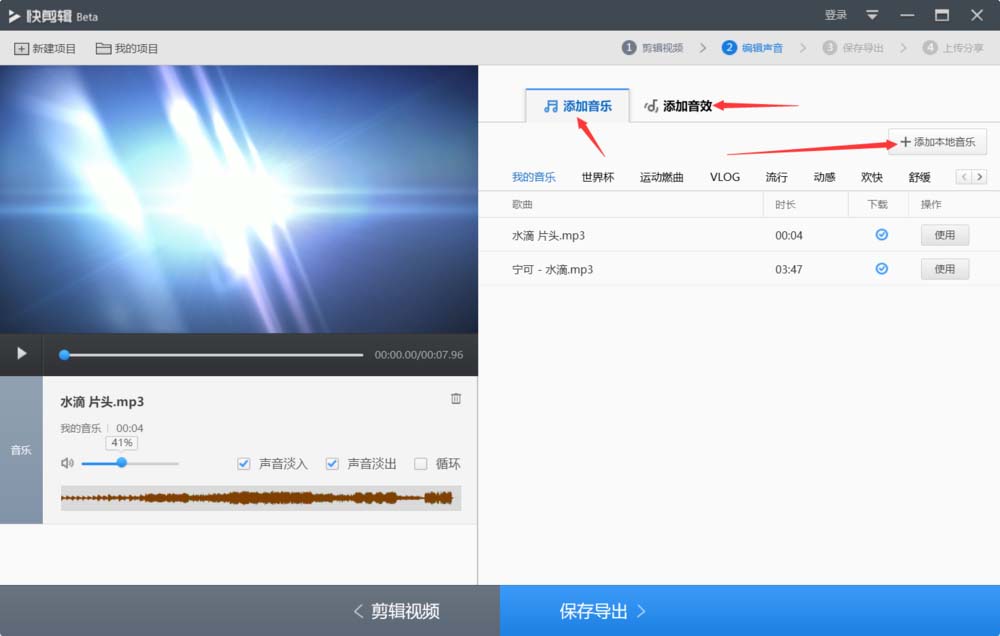 3、导入后点击下一步添加音频特效,如图所示;