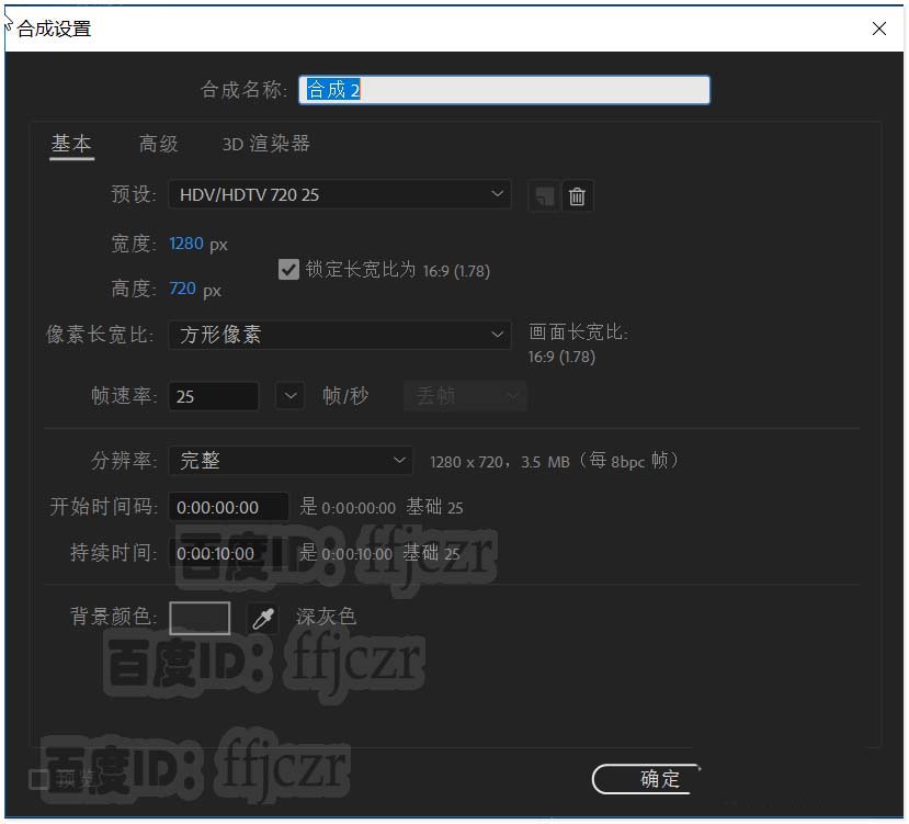 1、新建一个合成项目,分辨率为1280*720;方形像素,25帧率,其它参数如图所示。