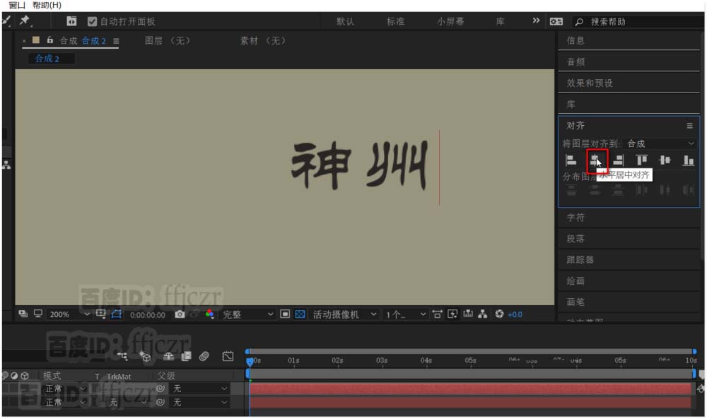 3、在合成层中添加一个文本层,在显示区输入相应的文字,调整到合适大小,并将文字居中。