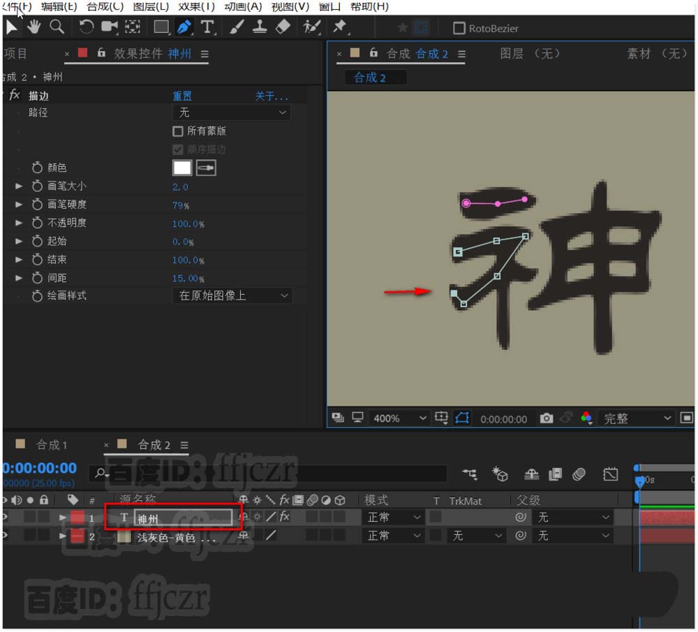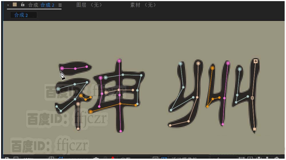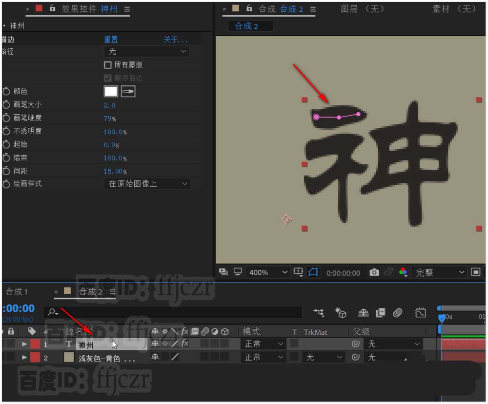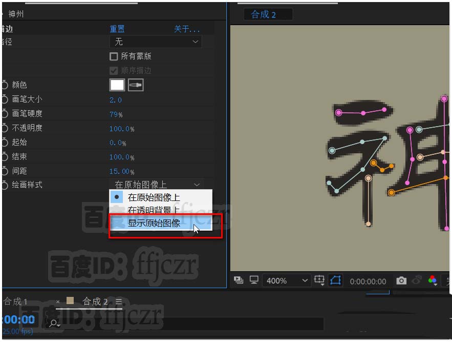 5、绘图样式选用在原始图像上,保持文本层始于选中状态;选用钢笔工具,放大文本到合适状态;用钢笔工具按文字的笔划顺序描写一遍。要注意每描完一个笔划,要重新选取文本层,让描边单独呈现。