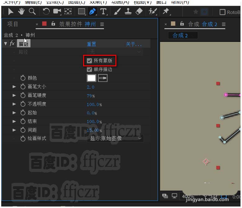 6、在描边选项栏中,将绘画样式改为显示原始图像,勾选所有蒙版;画笔大小调整到15.