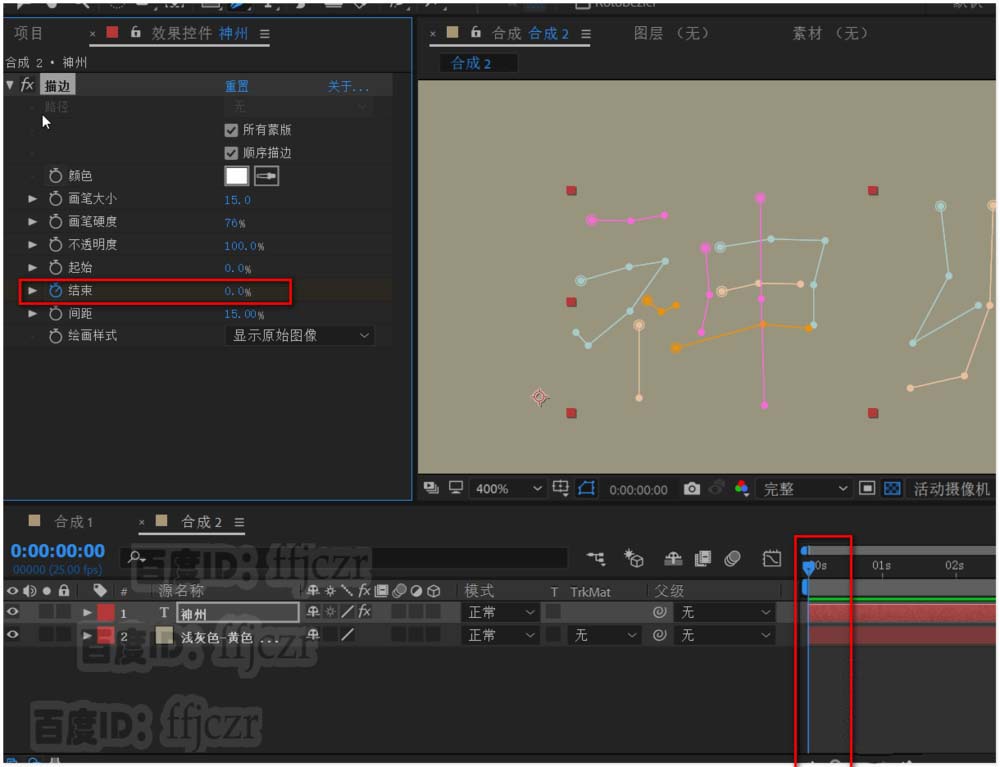 7、时间线在0时,激活结束选项的关键帧,数值为0%。