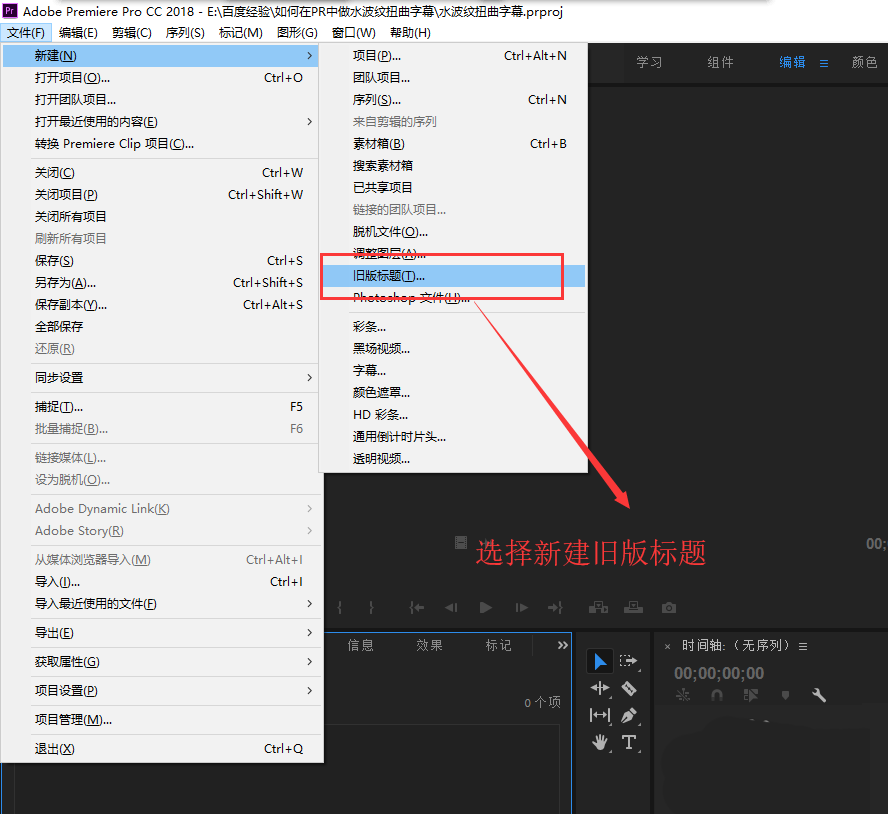 2、点开文件菜单,在文件菜单执行新建中的旧版标题命令,会弹出一个新建字幕的窗口,我们直接点击确定创建一个字幕。