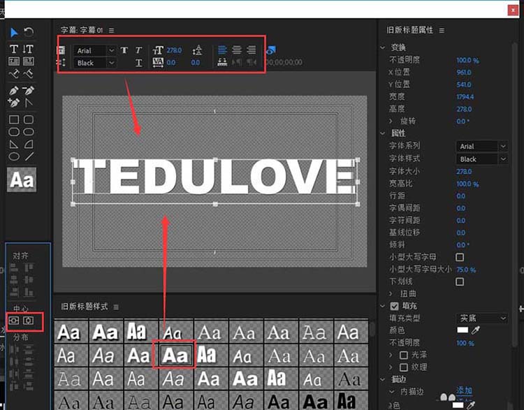 3、在自动弹出的字幕窗口中先输入字幕的文本内容,然后用选择工具选中输入的字幕,在字幕编辑窗口中调整字幕的大小等属性,为其添加字幕样式,并居中与垂直对齐。