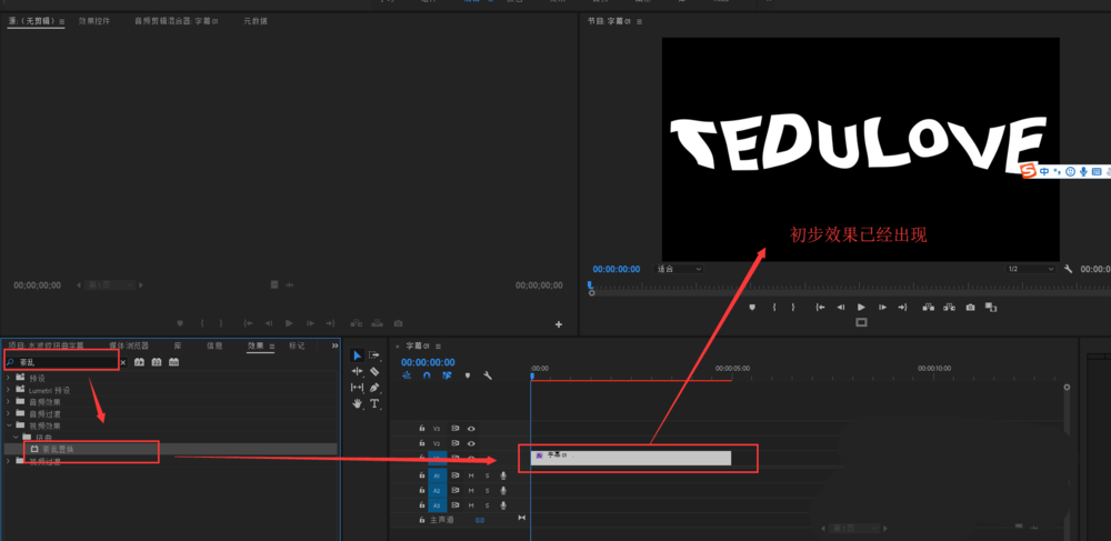 5、打开效果窗口,在效果窗口中搜索关键字“紊乱”,然后会出现一个“紊乱置换”的效果,选中该效果将其施加到字幕上,这时候一个静态的水波纹扭曲效果已经出现了,接下来我们将其做成动态的。