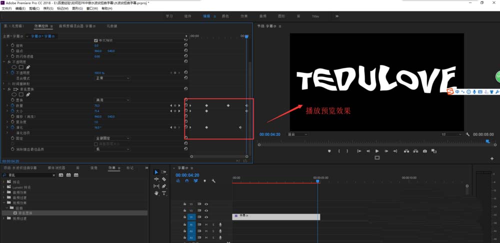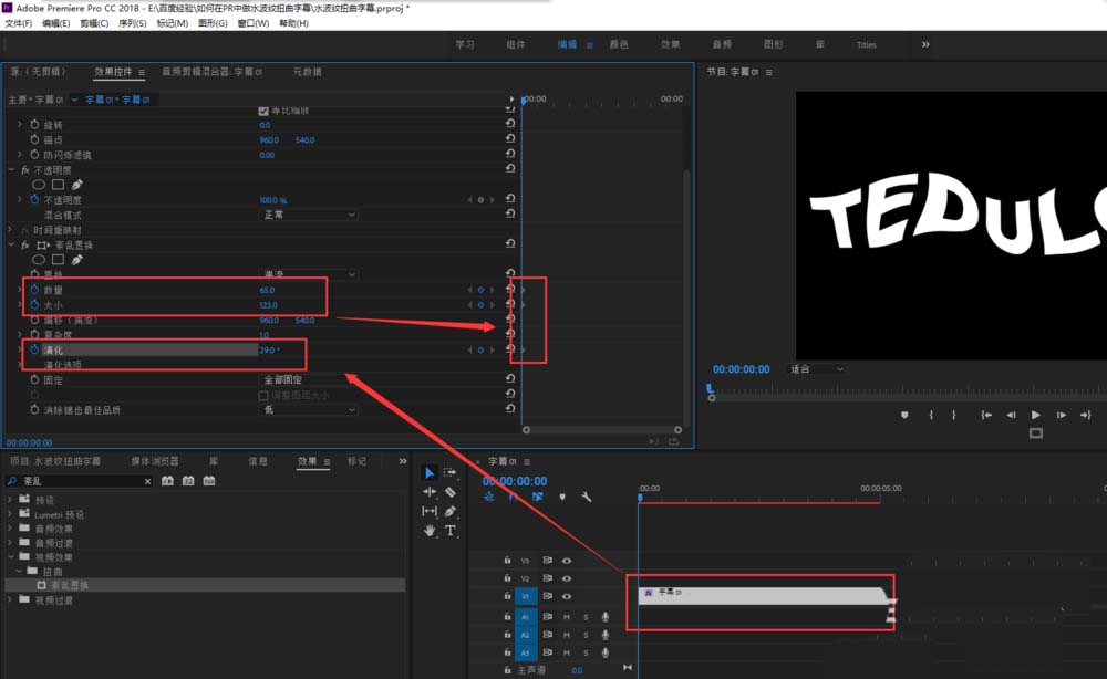6、选中字幕,打开效果控件窗口,在效果控件窗口中找到“紊乱置换”效果,调整数量、大小与演化的数值,并打入关键帧,然后每移动时间轴一段距离,就随机更改这三个选项的参数值。最后播放预览效果,一个动态的水波纹扭曲字幕就做好了。
