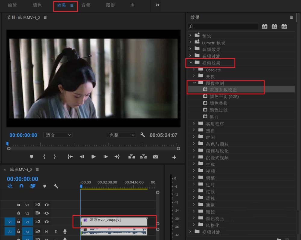 6、选中视频轨道,然后选择上方的效果选项卡,然后依次找到右侧的视频效果,图像控制,校正灰度系数,双击该项。