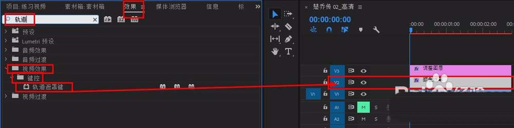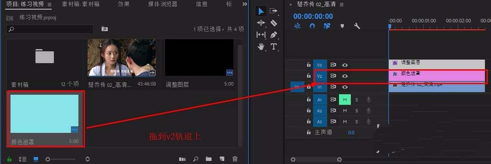 2、将颜色遮罩拖拽到v2轨道