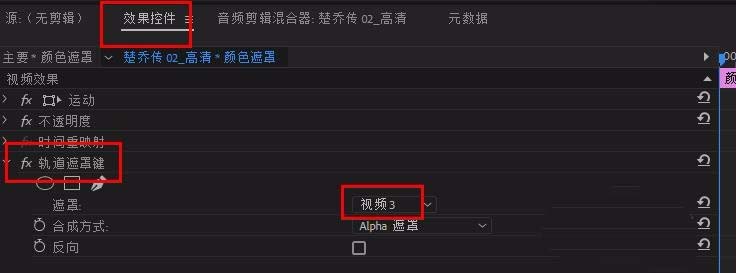 4、选中颜色遮罩,打开其“效果控件”面板,找到“轨道遮罩键”,修改“遮罩”为 视频3