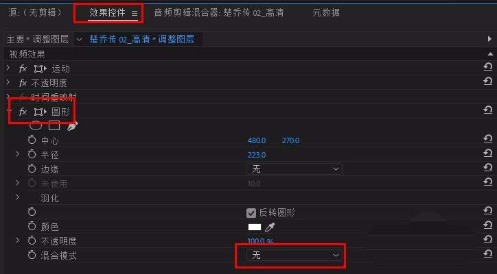 5、选中调整图层,打开其“效果控件”面板,找到“圆形”,修改“半径”数值(即圆形大小)到合适大小,”圆形-”混合模式“修改为 正常,勾选“反转圆形”,完成基本圆形建立