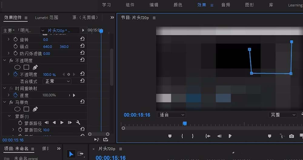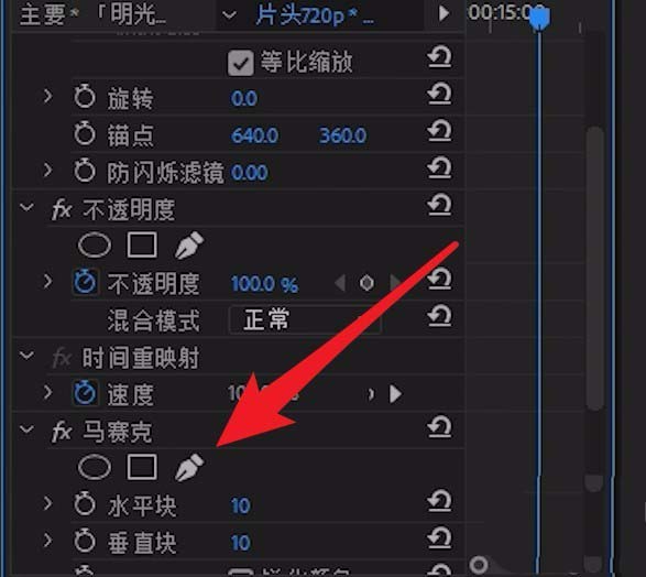4、然后在左侧的效果控件中找到马赛克效果,使用绘制工具。