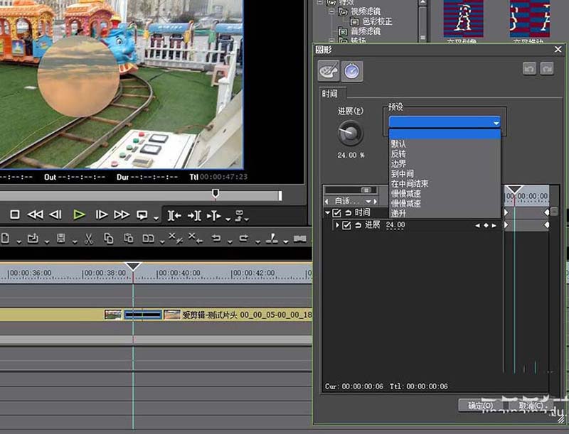 3、双击这个黄色的三角块,就打开了圆形转场的属性窗口