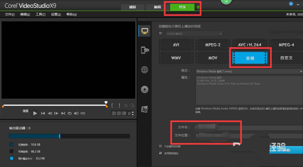 6、再点击共享、创设音频文件,设置好文件名和文件位置,再点击开始。音频开始渲染,当软件中跳出已成功渲染该文件,卡通声音就调好啦。