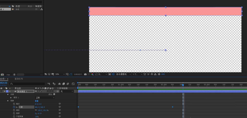 5、我们找到图层的变换——缩放,拖动矩形在开始时间的位置在画布外面,打下码表记录开始时间