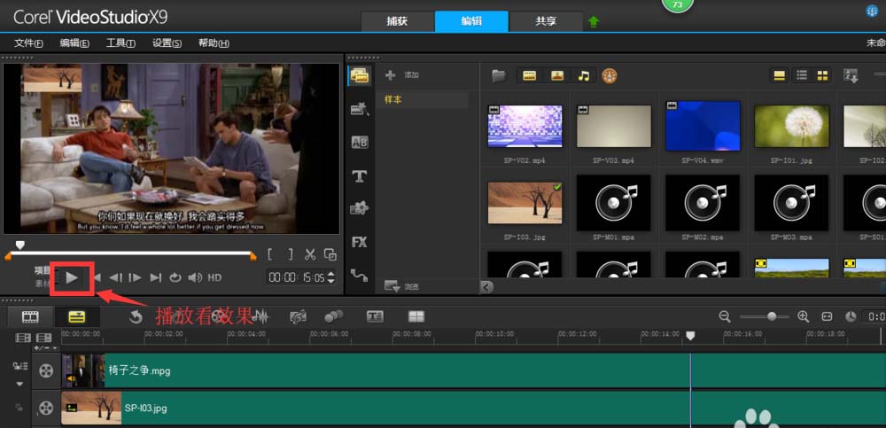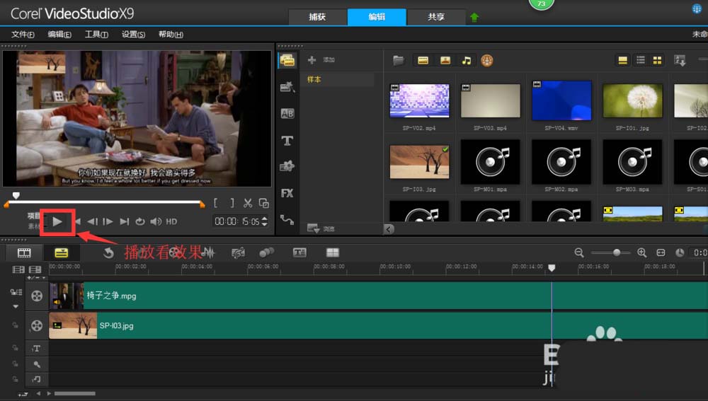 7、播放看看效果,再作适当调整。觉得效果不错,点击共享,MPEG-4,给文件命名并选好文件的位置,点击开始,渲染成功就OK啦。