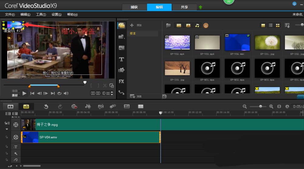 3、将覆叠轨上的视频缩小,拖到希望遮挡的文字或者图案上。