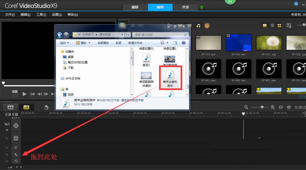 2、打开文件夹,将其中准备调制的音频文件拖到声音轨道上。还可以右击声音轨道,直接插入准备调制的音频文件。