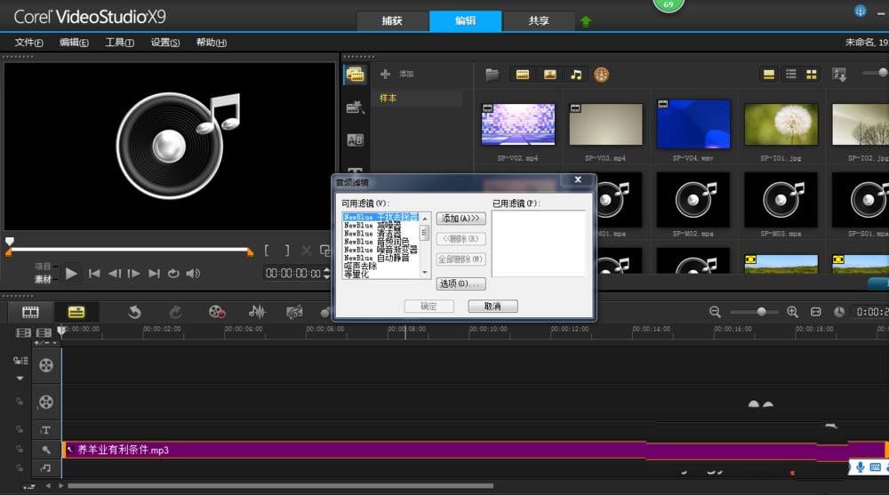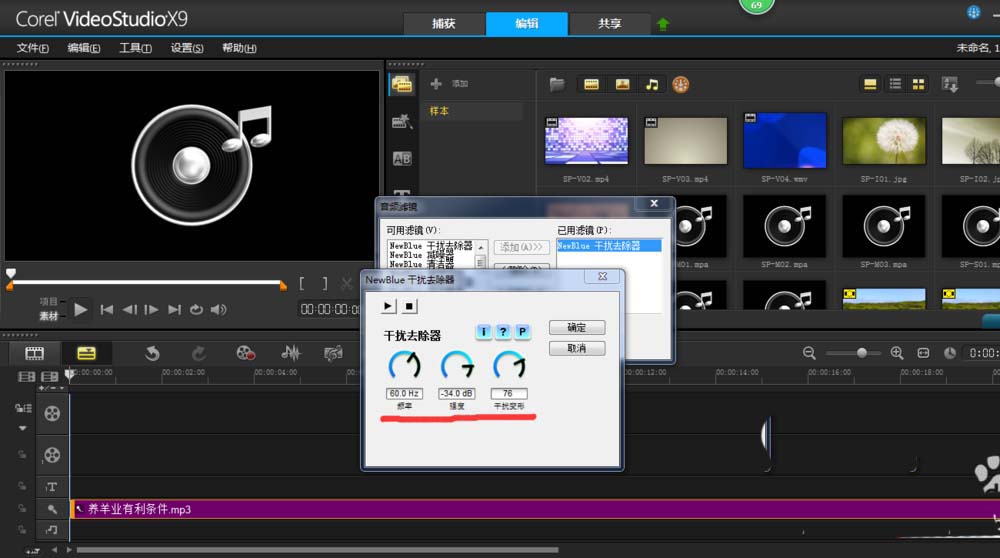 3、接着右击音频文件,选择音频滤镜。添加干扰去除器,点击选项,参数如图。