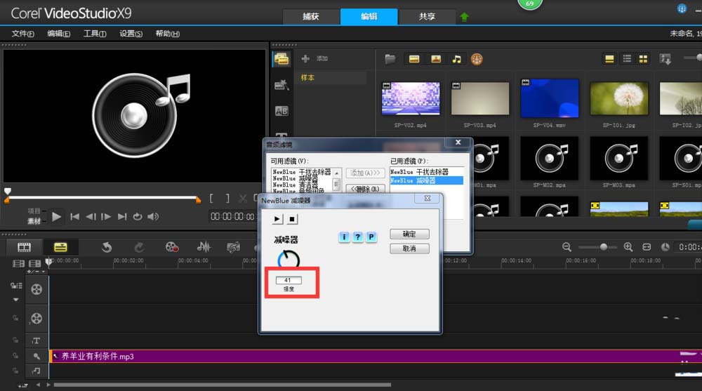 4、接着再添加减噪器,点击选项,如图参数为41。降低外部干扰和噪音。