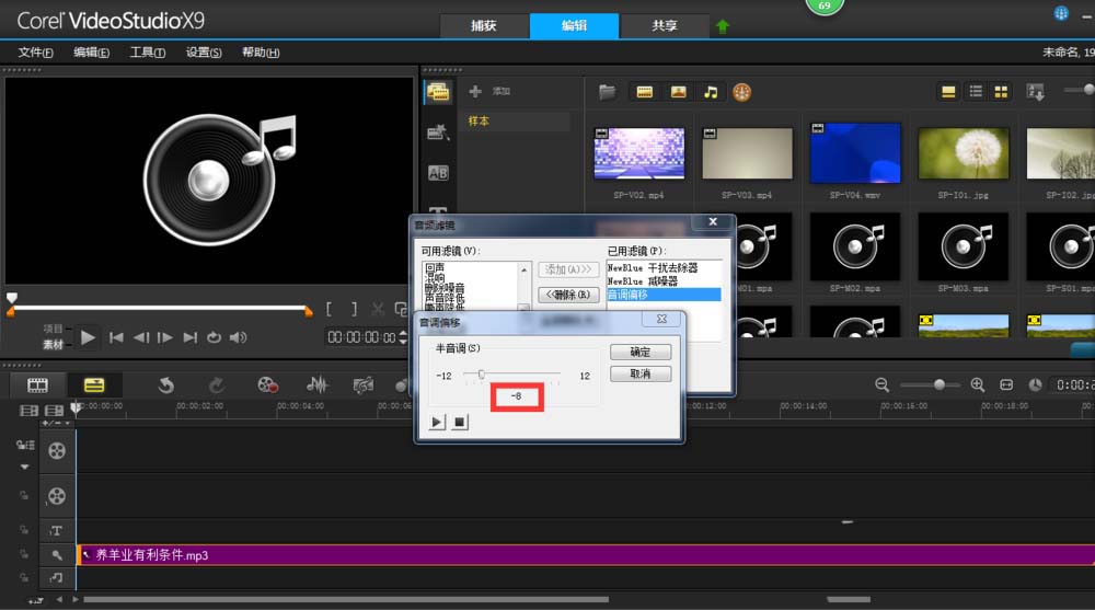 5、最后添加音调偏移,点击选项,如图半音调为-8。因为男声低沉,播放一下,听听效果。