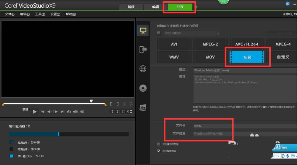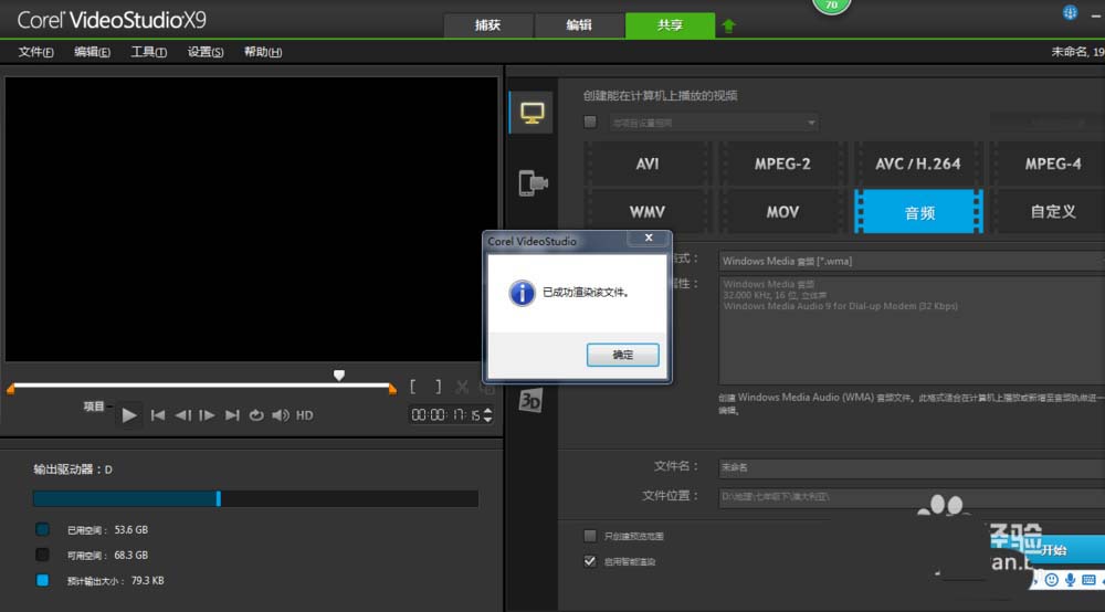 6、效果不错,点击共享,音频,命文件名和选择文件位置。点击开始,渲染完成就OK啦。