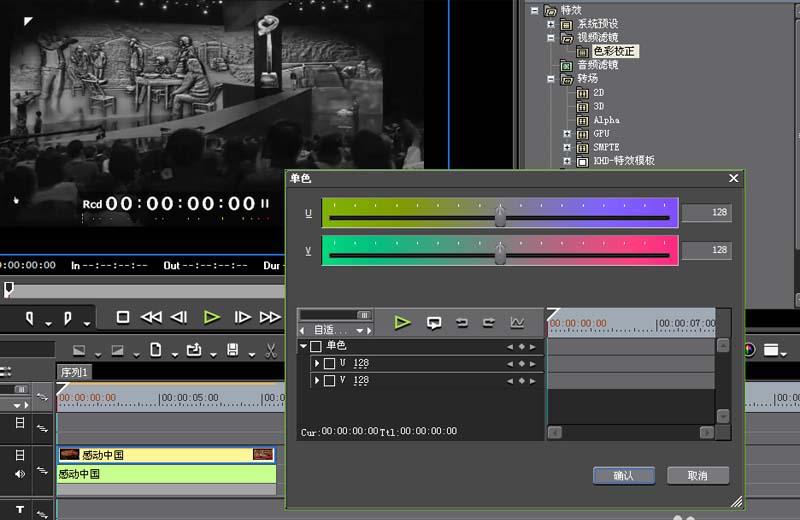 5、在单色对话框中勾选单色,并对u和v分别添加关键帧,选择一定的时间段,再次添加关键帧。