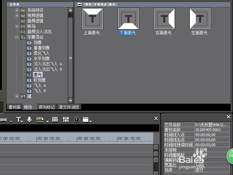 4、切换到特效库,从字幕混合中选择激光,接着拖拽下面激光到t轨道上。