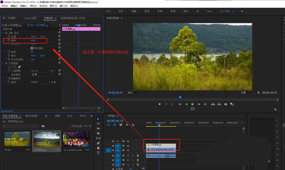 2、在选择第二个静态图片素材,将其拖到时间轴的视频轨道2上,并在效果控件中将图片素材做适当的缩放处理。