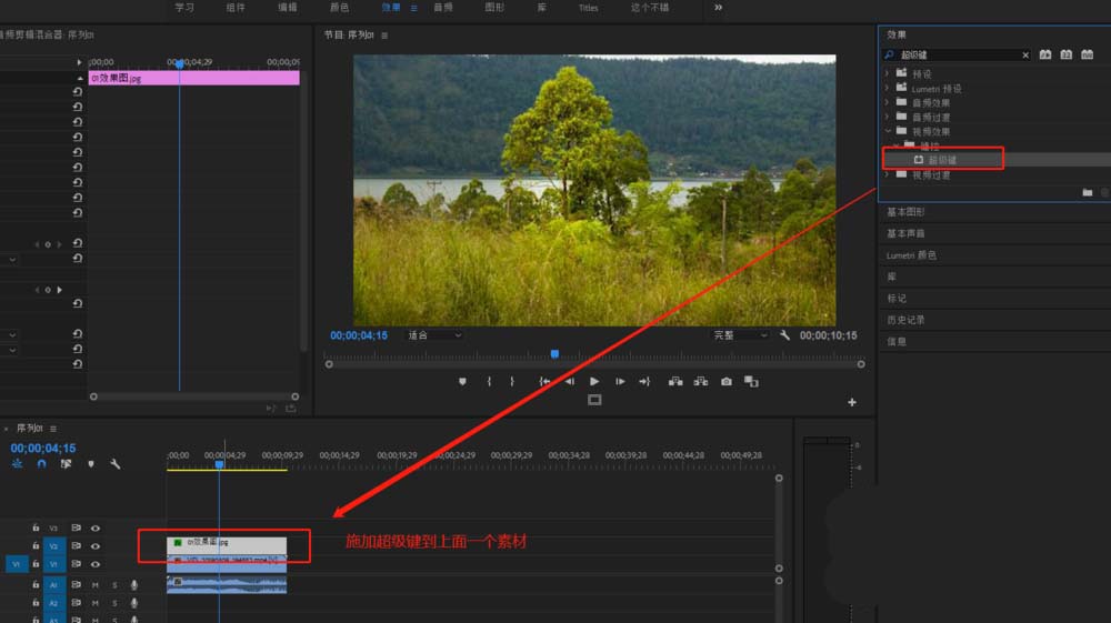 4、单击鼠标左键选中查找到的超级键的视频效果,按住鼠标左键不松进行拖动,将其添加到视频轨道2的静态图片素材上。