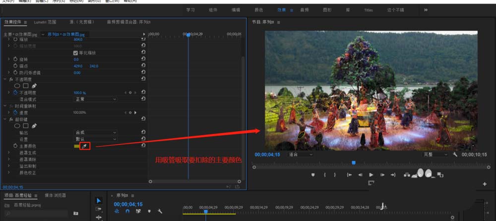 5、选中视频轨道2静态图片素材,打开效果控件找到超级键,在超级键的主要颜色上选择吸管,用吸管在静态素材上的主要颜色上进行吸取点击。