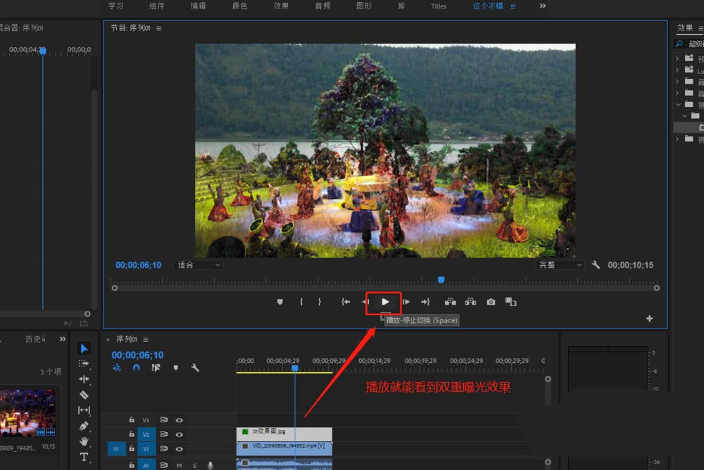 6、超级键吸取了颜色之后就会把静态图片的主要颜色给扣除了,在播放时间轴,就能看到一个双重曝光的视频效果就出现了。