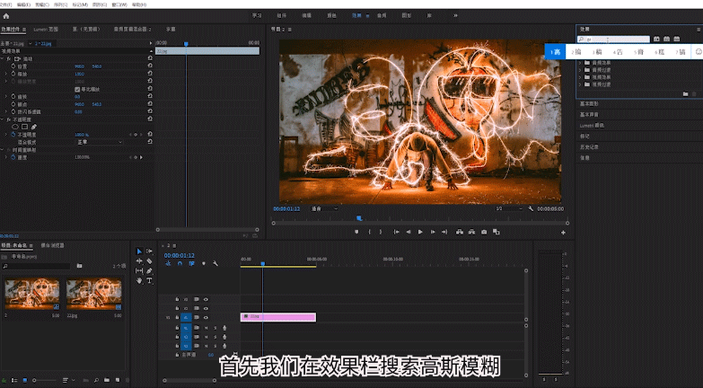 1、首先在效果栏搜索高斯模糊,然后将高斯模糊拖入到视频素材上,找到效果控件面板。