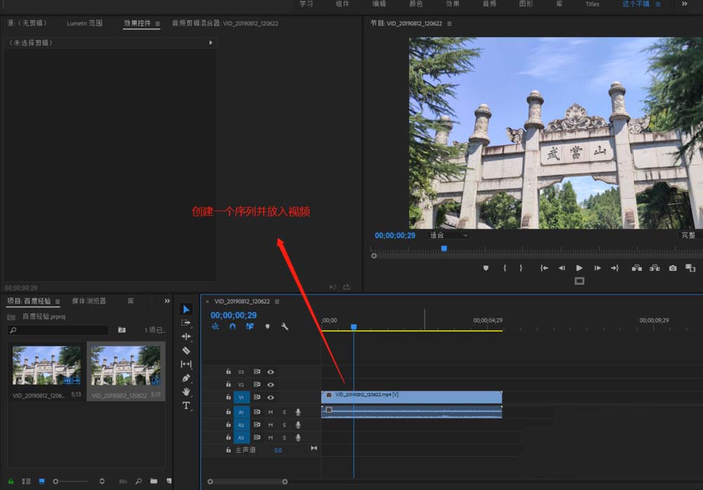 2、在来根据项目的要求或视频文件的大小属性来新建一个序列,将导入的视频文件拖入序列的视频轨道1中。