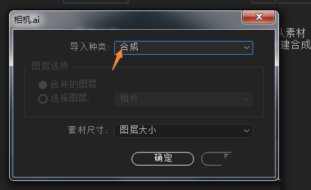 2、我们首先打开AE软件,把相机素材导入到AE软件中,它的导入种类选择“合成”,素材尺寸选择图层大小。点击确定,素材文件就导入到AE软件中了。