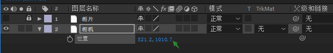 4、然后再设置它的位置,按快捷键P键打开它的位置属性,在第0帧的时候,将相机Y轴的数值设置超出整个合成区域,让相机一开始的时候是一个不可见的状态。