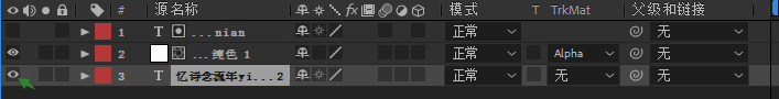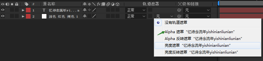 5、接着,我们把纯色图层放到文字图层的下方,点击下方第二个图标展开“转换控制”窗格,然后在右方轨道蒙版的属性上选择Alha遮罩,这样上方的文字图层就被复制到了白色的位移动画上面。