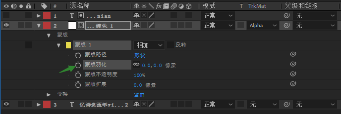 7、最后在纯色图层的属性里面找到蒙版羽化,修改一下数值,让光的边缘更加柔和一些,这样我们就做好了扫描文字光效的动画。