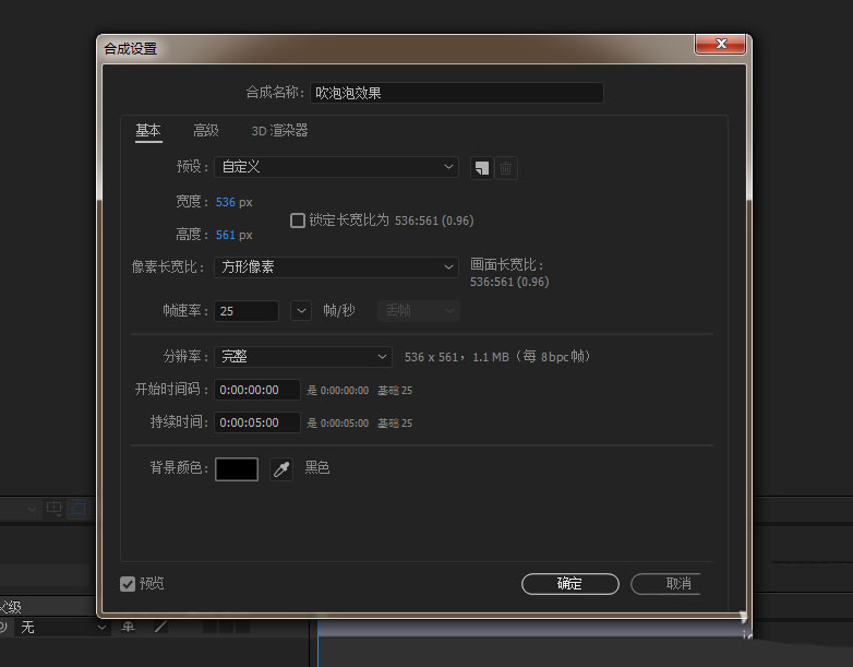 1、打开AE软件,命名吹泡泡效果,调整相应的参数。