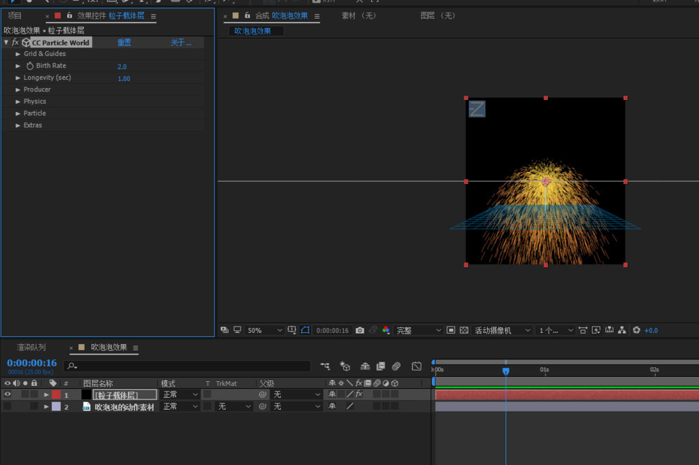 4、选中载体层添加CC Particle World效果;效果-模拟-CC Particle World,按下空格键就可以看到默认的粒子效果是怎么样的了。
