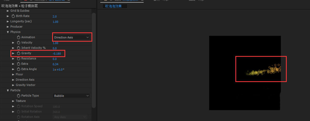 5、我们粒子类型(Particle Type)更改为泡泡(Bubble),你也可以根据自己的喜好尝试其他类型。我们这里将物理性动画参数(Animation),设定为:方向坐标(Direction Axis)。我们进一步调整物理重力参数(Gravity),使粒子产生向上飘动的效果。