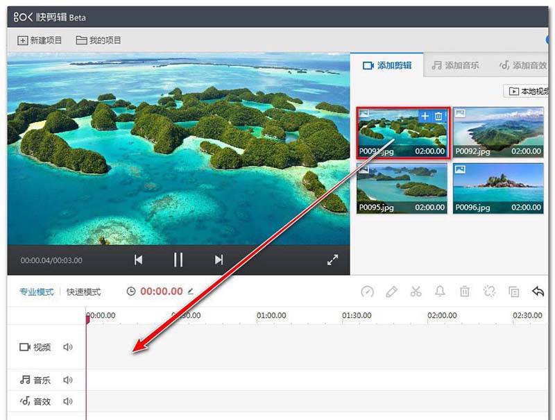 1、打开快剪辑软件添加图片素材后,可以用鼠标选中图片后,然后左键不送把图片添加到视频轨。