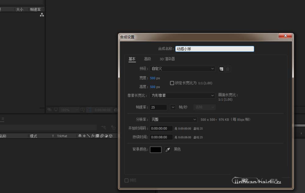 1、打开AE软件,新建合成命名动感小球,调整相应的参数。