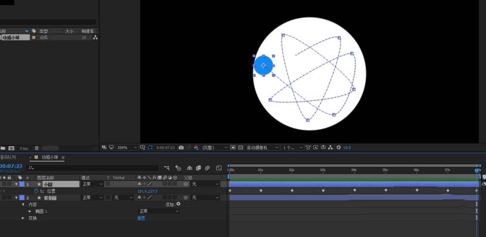 4、接下来我们需要做小圆在大圆范围内的运动路径了,选中小圆按下P键,给位置属性K帧,在k位置的帧的时候,要注意小球要贴合大球内壁,让它有落地的感觉。