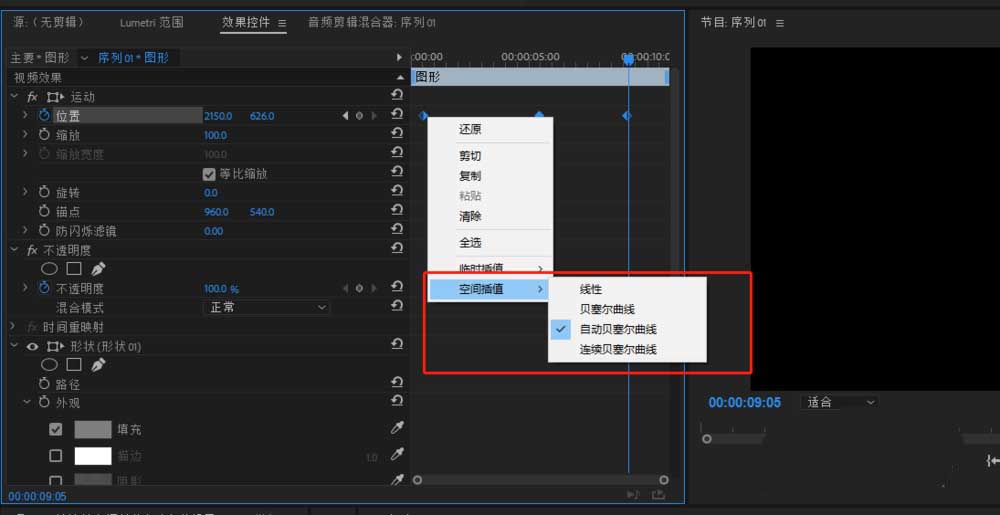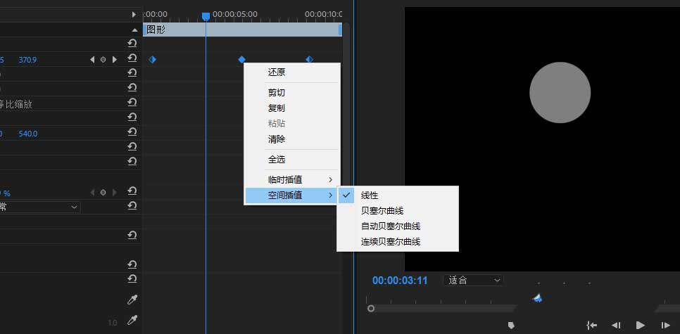 4、框选选中设置的运动关键帧,右键鼠标,找到控件插值,可以看到当前的运动效果是自动贝塞尔曲线效果。代表当前正圆按照曲线路径运动。