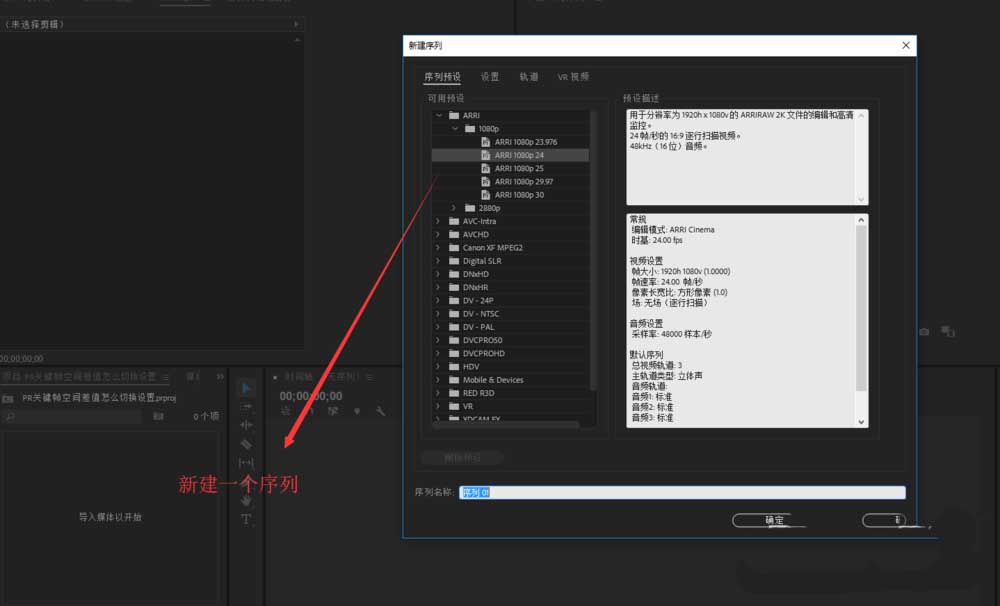 1、在一个空PR项目中新建一个序列,在新建序列对话窗中直接选择一个预设序列即可。