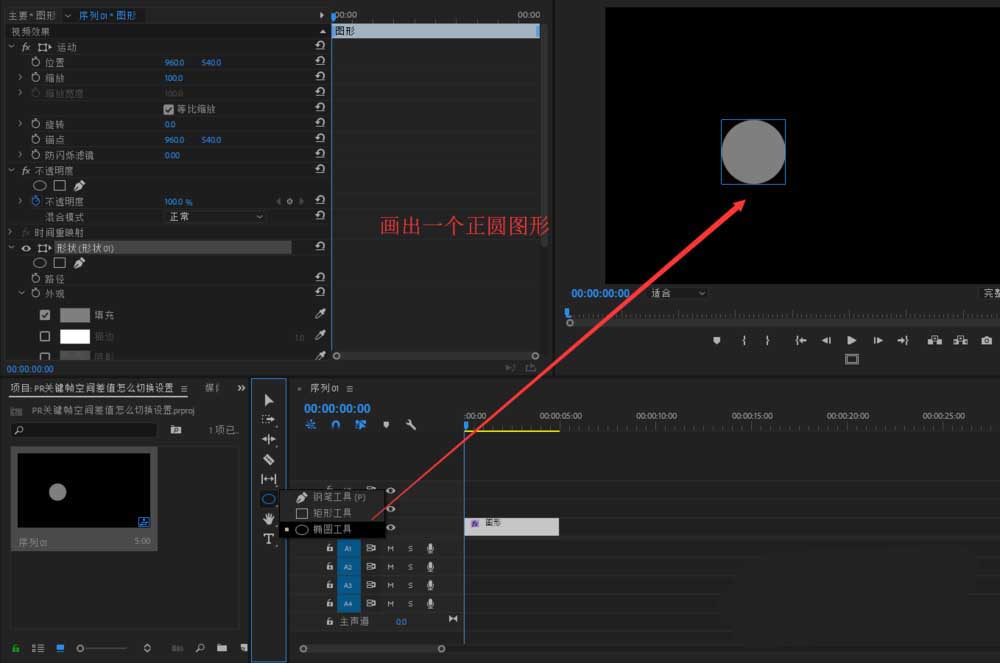2、找到工具栏中的椭圆工具,使用椭圆工具结合相应的辅助键在序列上绘制出一个大小差不多的正圆图形出来。
