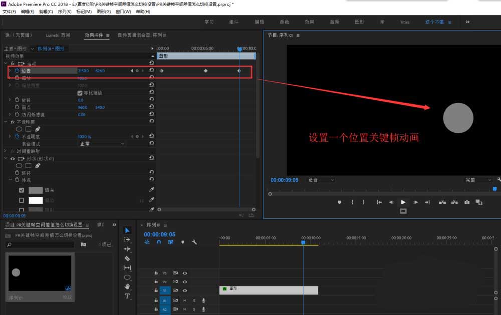 3、选择绘制的正圆图形,在效果控件窗口中为当前的正圆图形设置一个位置的运动关键帧动画。
